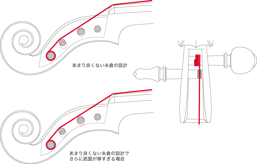 - ヴァイオリン製作において、糸倉(ペグボックス)の設計理論自体を知らない製作者もずいぶんいるものです。糸倉を設計するときに、単純にデザイン的に設計してしまっているのです。この様な糸倉の場合に、上記のようなトラブルが生じることが多くなります。本来の糸倉の設計は、まずは弦、糸巻き、指板、オーバーザッテルの配置からスタートします。そしてその周りに肉付け(糸倉の輪郭)が施されるのです。