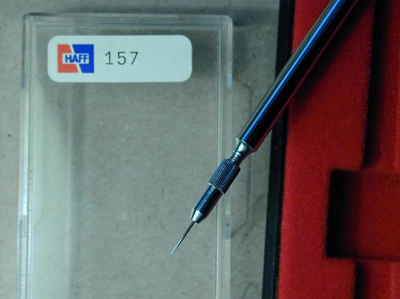 - 次は、元々付いていた測定端を外し(簡単に外すことができます)、そこにシャープペンシルの芯を付けられるような器具をねじ込むことです。私の場合には、たまたまここにピッタリと装着できる製図用器具の部品(ドイツ「HAFF」製、製図用ケガキ針)を見つけ、その先端部分のみを切り落として利用しています。使用する芯は0.7〜0.9mm位がちょうどよいです。