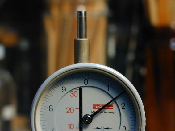 - 上写真はヴァイオリン製作においてはごく一般的なシュネルメッサー(精密厚み測定器)です。このシュネルメッサーを若干改良するだけで、「精密等厚線引き」が出来上がります。まず行うことは、計測器の主軸にネジを切ることです。改良するための具体的なテクニックをこの場で書いていてはきりがないので、この場においては最低限にします。