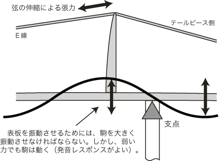 魂柱、すなわち「支点」を駒に近づけることにより、駒の振動を大きく増幅して、表板を振動させることができます。しかし逆に言えば、駒は素直な振動をにくくなります。こうすると高い倍音成分が出やすくなります。