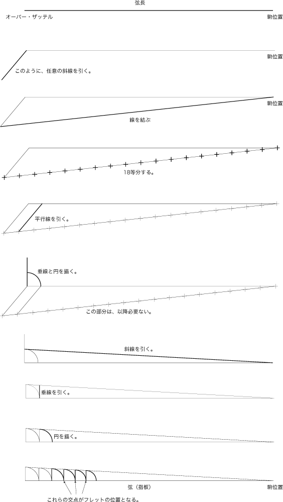 数学的な意味では当時において、既に「平均率」の理論は確立されており、計算によってフレット位置を求めることは決して不可能なことではなかったと思います。しかし、数学的な教育を受けていない製作者が、それも手の計算によってそれを実際の製作に応用することは困難だったことでしょう。そこで彼らは、「製図的な手法」によってフレット位置を求めることをあみ出したのです。