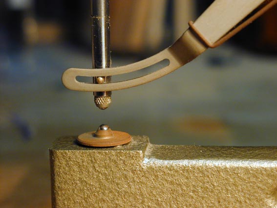 - 上写真はヴァイオリン製作においてはごく一般的なシュネルメッサー(精密厚み測定器)です。このシュネルメッサーを若干改良するだけで、「精密等厚線引き」が出来上がります。まず行うことは、計測器の主軸にネジを切ることです。改良するための具体的なテクニックをこの場で書いていてはきりがないので、この場においては最低限にします。